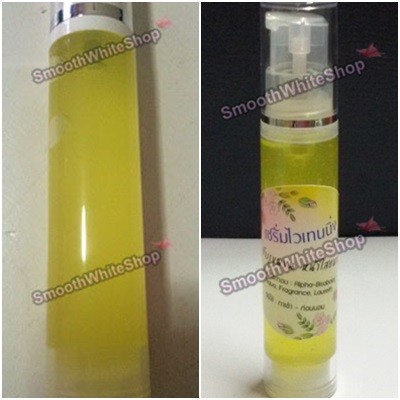 เซรั่มไวท์เทนนิ่ง (เซรั่มหน้าใส) เนื้อเซรั่มเข้มข้นมากสีเหลือง ช่วยให้ผิวหน้ากระจ่างใส ฟื้นฟูสภาพผิวที่เสีย รักษาสิวหัวหนอง สิวอักเสบ ช่วยให้หน้าฉ่ำวาว